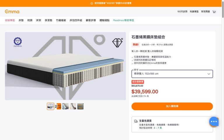 官網上促銷專區有促銷組合的活動,若購買「德國Emma新科技石墨烯黑鑽床墊」+「高科技防蟎防水Emma床墊保潔墊」+「2顆涼感科技黑鑽石記憶枕」,2024年3月19號看官網促銷套組價格為39599元,若想以更便宜的價格購買到這套組,本篇文章最後有最新的優惠碼整理,以及如何以優惠價格購入的資訊。